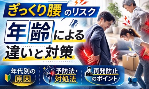 ① ぎっくり腰は年齢で違う?まず結論 ぎっくり腰って、「どの年齢でも同じ原因で起こるの?」と疑問に思う方は多いですよね。結論からお伝えすると、ぎっくり腰は年齢によって起こりやすい原因が変わる傾向があると言われています。 …