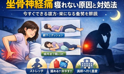① 坐骨神経痛で寝れないのはなぜ?まず結論 「坐骨神経痛で夜だけ痛くなるんだけど、なんで寝れないの?」 こう感じて検索している方は、実はかなり多いと言われています。 結論からいうと、坐骨神経痛で寝れない理由はひとつではな…