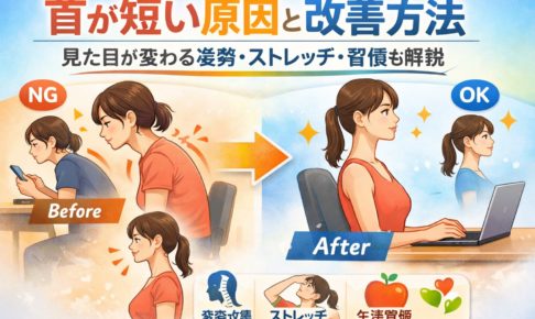 ① 首が短いのはなぜ?まず結論 1-1 首が短い原因は「姿勢や筋肉バランス」と言われている 「首が短いのって、生まれつきじゃないの?」と感じている方は多いかもしれません。ですが、実際には首そのものの長さよりも、姿勢や筋肉…