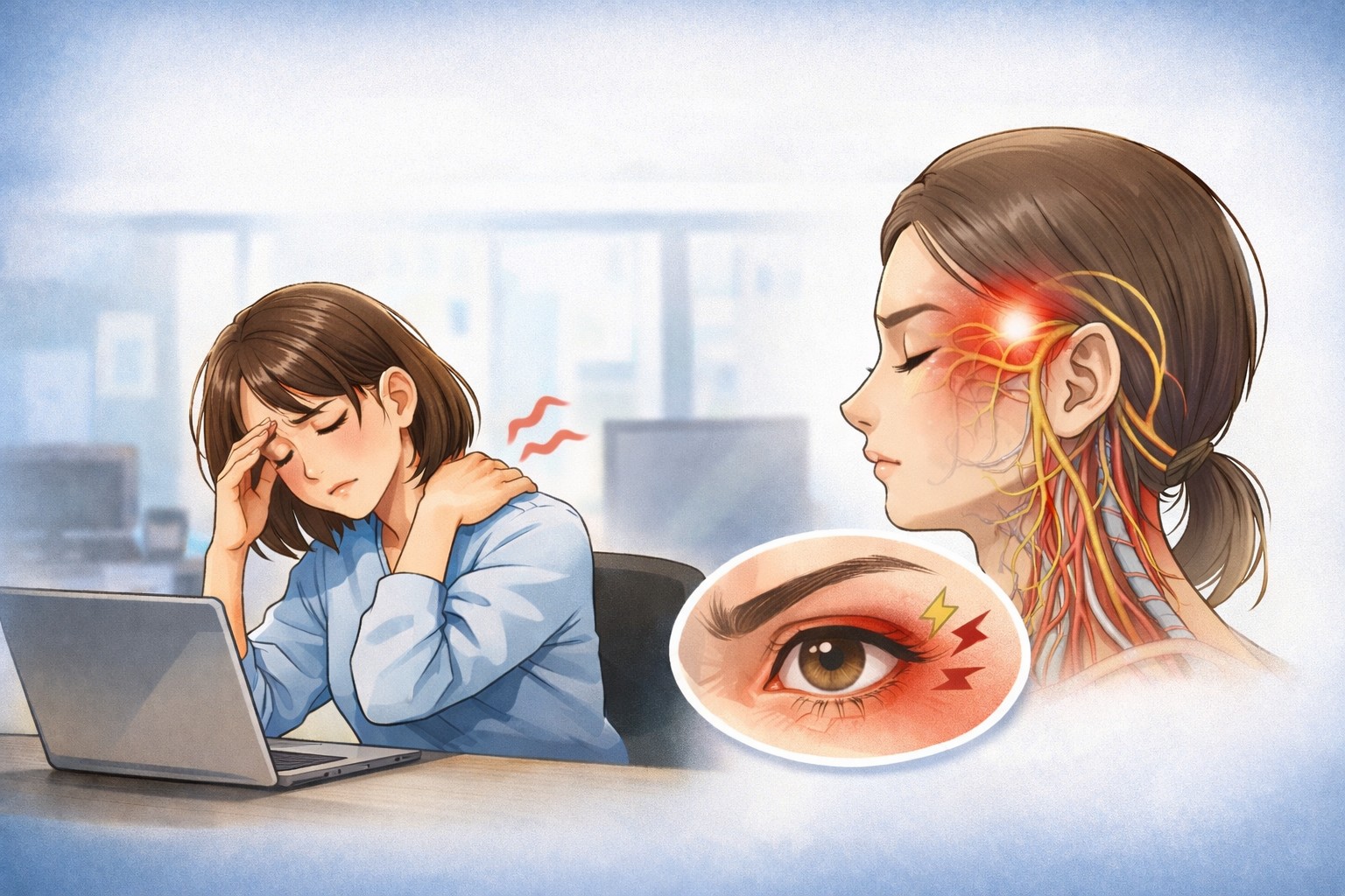 筋肉が緊張した状態が続くと、神経や血管への圧迫が起こりやすくなり、結果として頭痛や目の奥の違和感につながる可能性があるとされています。特に「夕方になると重くなる」「画面を見続けたあとに痛む」という場合は、この影響が関係していることもあるようです。