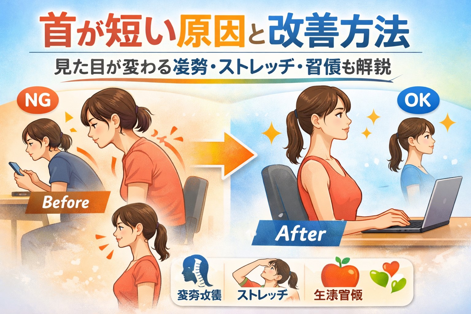 まずは、「首が短いのは変えられない」と思い込まず、見え方や姿勢の影響もあるかもしれない、という視点を持つことがスタートになります。