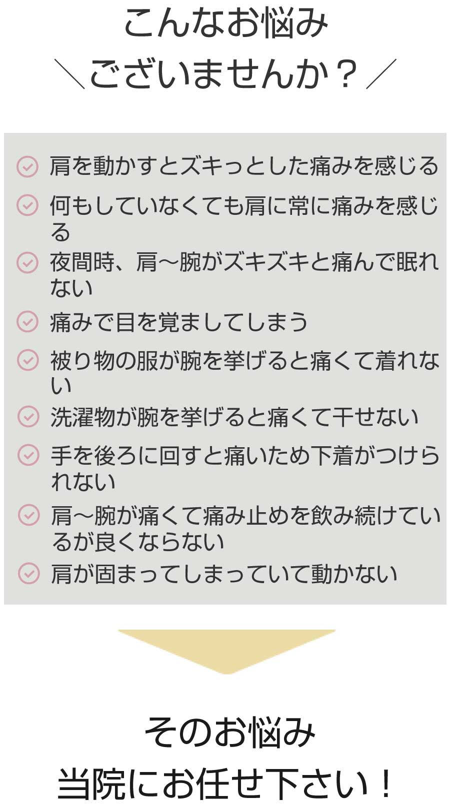 約5年前、右肩痛となり、昨年春くらいまで困っていましたが、自然治癒。その直後、左肩痛発症就寝中痛みで目が覚め、日中もズキズキした痛みがあり困っていました。