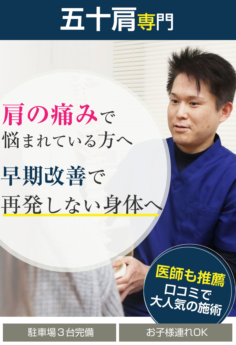 五十肩もだんだん良くなりつつあります。問診が細かく丁寧なところが他の院とは違います。良く説明してくださるし、確かな施術で、こちらの院に出会って本当に良かったです。