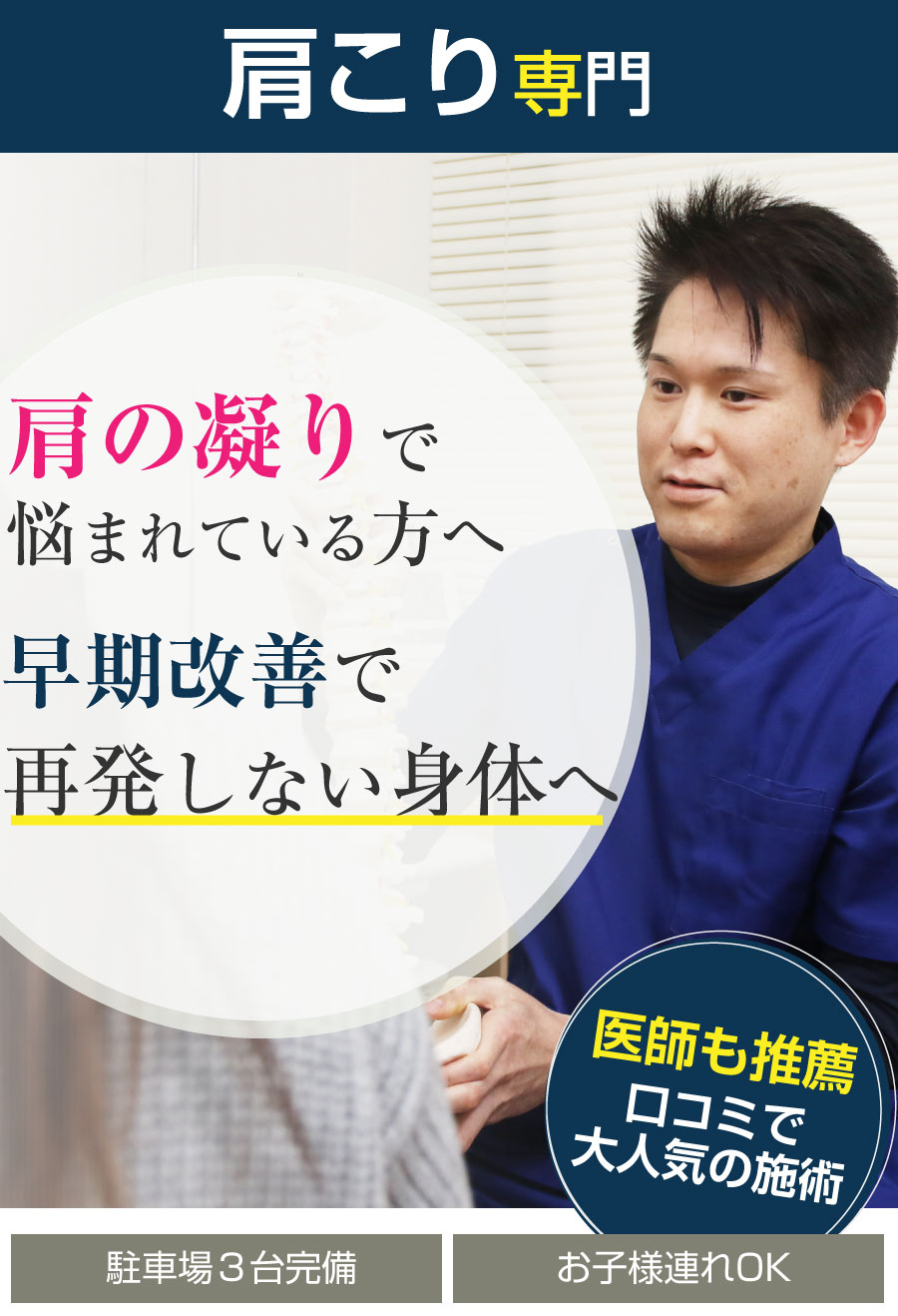 当院では肩こりに対してその方に合ったアプローチをしていくことでしっかり肩こりのを解消できるよう施術していきますので、辛い日々を過ごされている方は一度当院にご相談下さい。